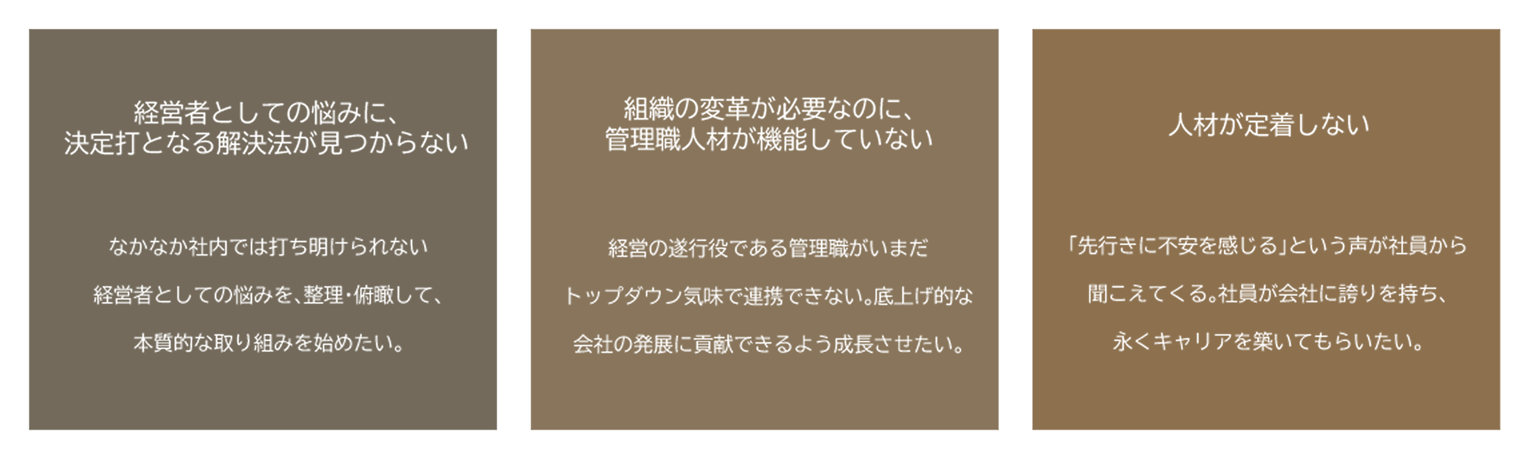 経営層が抱えるさまざまな「困りごと」をクリアにして、 人と組織の『行動変容』を通じて本質的課題の解決に伴走します。課題に応じた適切なアプローチによって、組織全体のパフォーマンスの向上を目指します。